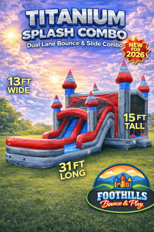 Turn your backyard into a giant inflatable playground with the Titanium Splash Dual Lane Combo! This commercial-grade inflatable combines a large bounce house, climbing wall, and dual racing slides for nonstop excitement.