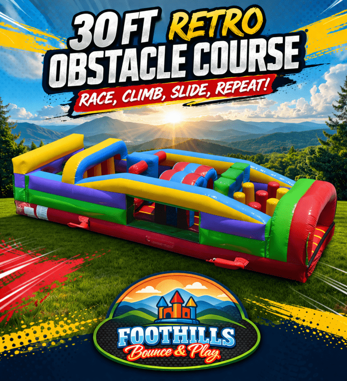 The 30ft Retro Obstacle Course rental in King, NC is a high-energy inflatable designed for racing, competition, and nonstop fun. This inflatable obstacle course is perfect for backyard parties, birthday celebrations, school field days, church events, and community gatherings throughout the Triad area.