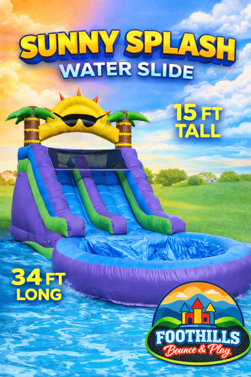 The cheerful sunshine and palm tree design makes it perfect for summer parties, birthdays, school events, church gatherings, and backyard celebrations. The dual lanes keep the line moving and double the fun, making it a great choice for groups of kids who want to slide again and again.
